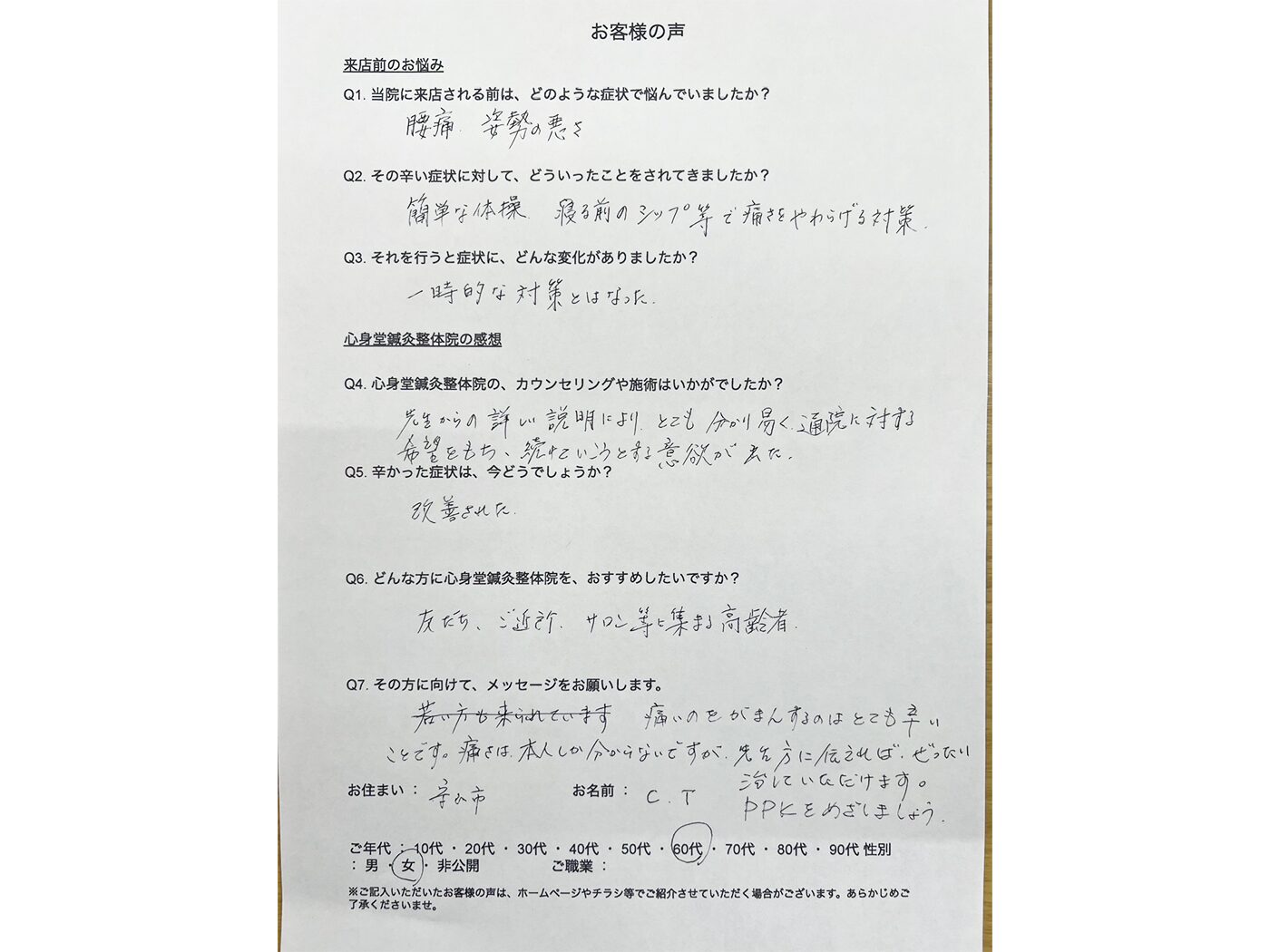 腰痛と姿勢の悪さに悩んでいました。自身で簡単な体操や寝る前の湿布などで痛さをやわらげる対策をしていました。心身堂さんでは先生方の詳しい説明により、通院に対する希望を持ち続けていこうという希望が出ました。