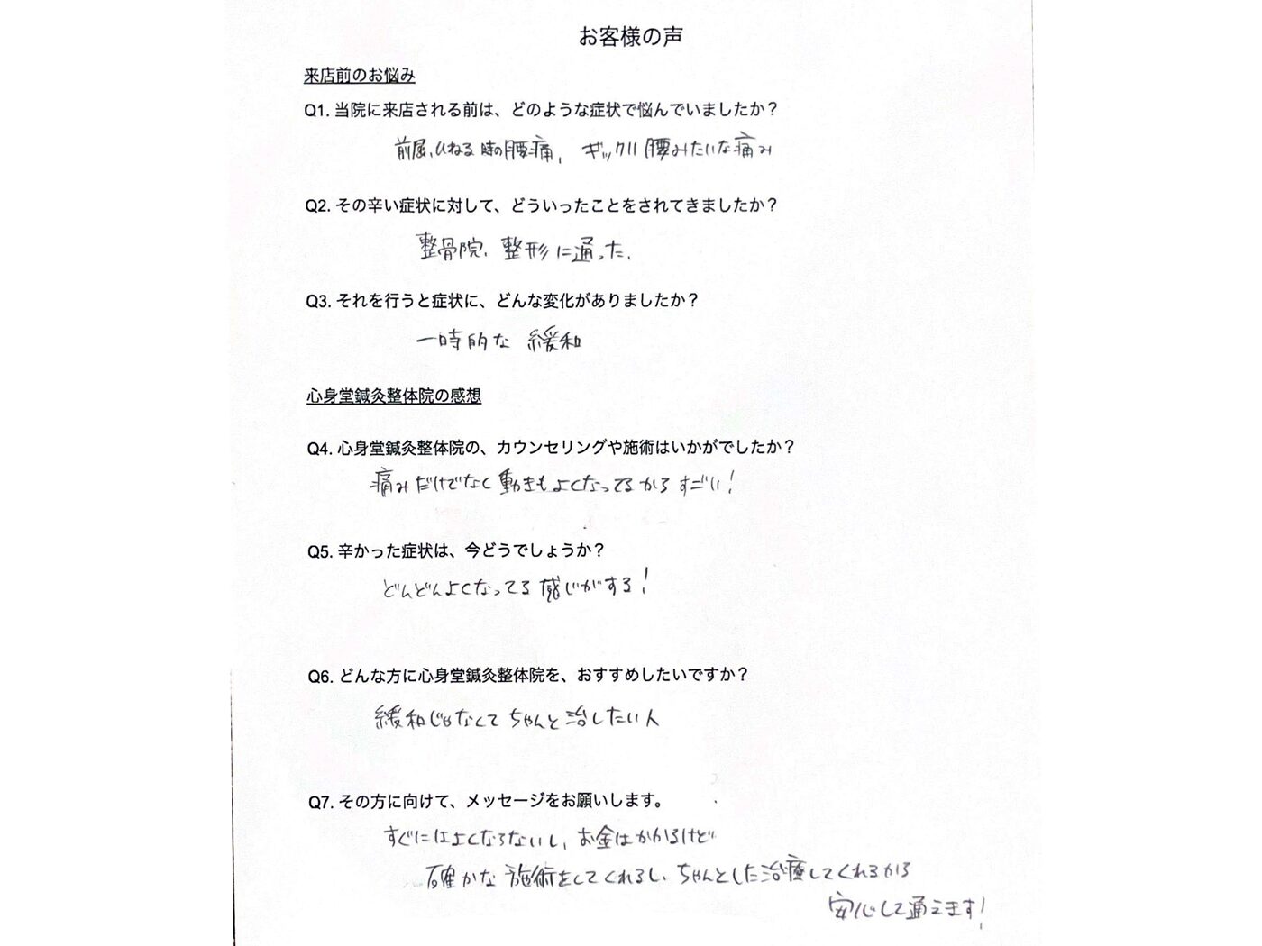 前屈やひねりなどの腰の動きが辛く、ぎっくり腰のような痛みを感じていました。整形外科や整骨院に通うなどしていましたが、一時的に緩和するものの、良くならずにいました。心身堂さんに通い始めて、痛みだけではなく動きもよくなっているからすごい!一時的な緩和ではなく、ちゃんと良くしたい人に心身堂さんはおススメです。